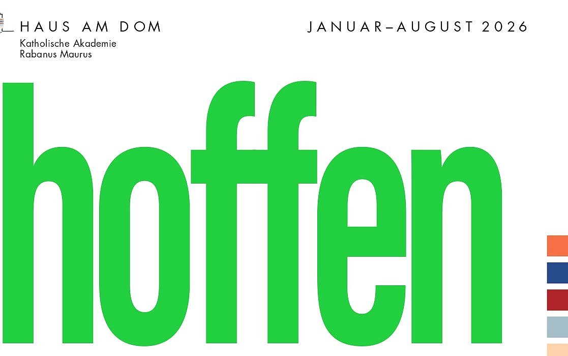 hoffen: das steht in riesigen Buchstaben auf dem Programmheft der Katholischen Akademie Rabanus Maurus fürs erste Halbjahr 2026. Damit es auch wirklich gar keinen Zweifel an der Wucht des Wortes gibt, hat man sich bei der Farbgebung für Neongrün entschieden und die Buchstaben laufen Seitenbreit von Rand zu Rand. Die Botschaft: Hoffnung hat Wucht, Hoffnung ist Kraft.