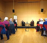 Haus am Dom Den Weg in Demut fortsetzen A. Zegelman / Bistum Limburg Joachim Valentin und Erzbischof Éric de Moulins-Beaufort beim Domgespräch - vor einem vollen Großen Saal. FRANKFURT, 28.01.2023 Den