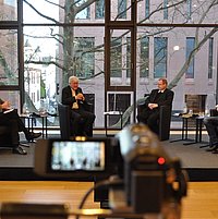 Haus am Dom Katholische Akademie verdoppelt Zuschauerzahlen A. Zegelman / Bistum Limburg Bischof Georg Bätzing und EKD-Ratsvorsitzender Heinrich-Bedford-Strohm diskutierten im April 2021 beim Abschlus