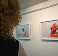 Haus am Dom Ein Gefühl von Es-geschafft-haben A. Zegelman / Bistum Limburg Wend-Yiida vor Portraits, die Fotografin Sandra Mann von ihr angefertigt hat. FRANKFURT, 01.04.2022 Ein Gefühl von Es-geschaf