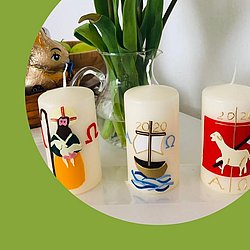 In diesem Kreativworkshop kann man eine ganz persönliche Osterkerze entwerfen. Mit farbigen Wachsplatten lassen sich verschiedene Symbole und Motive ausschneiden und auf der Kerze arrangieren. Für Schriftzüge und feine Details steht Metallic-Beschriftungsfolie zur Verfügung. Ob klassisch mit Kreuz, Alpha und Omega oder bunt und abstrakt – eine Kerze ganz nach persönlichem Geschmack.